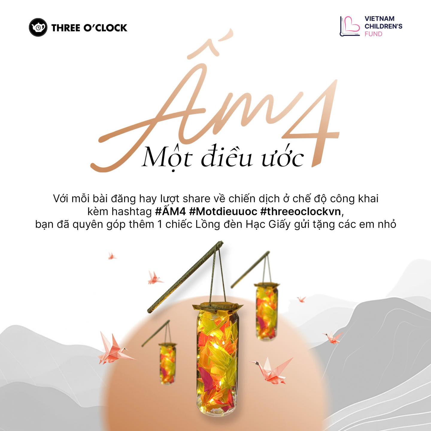 💛 Bên cạnh đó, với mỗi lượt chia sẻ hình ảnh hay bài đăng về chiến dịch ở chế độ công khai kèm hashtag #ẤM4 #Mộtđiềuước #Threeoclockvn, bạn đã quyên góp thêm 1 chiếc Lồng đèn Hạc Giấy trao tặng các em.